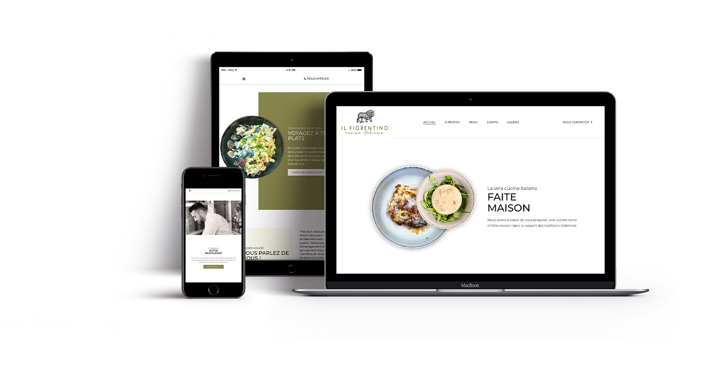 Pour la création d’un site tel que des restaurants ou du service, l’accès à la prise de contact doit être trouvé dès le « premier coup d’œil ». C’est pourquoi les icônes téléphone et contact figurent en haut à droite. L’utilisateur doit pouvoir contacter par ces deux moyens sans chercher.