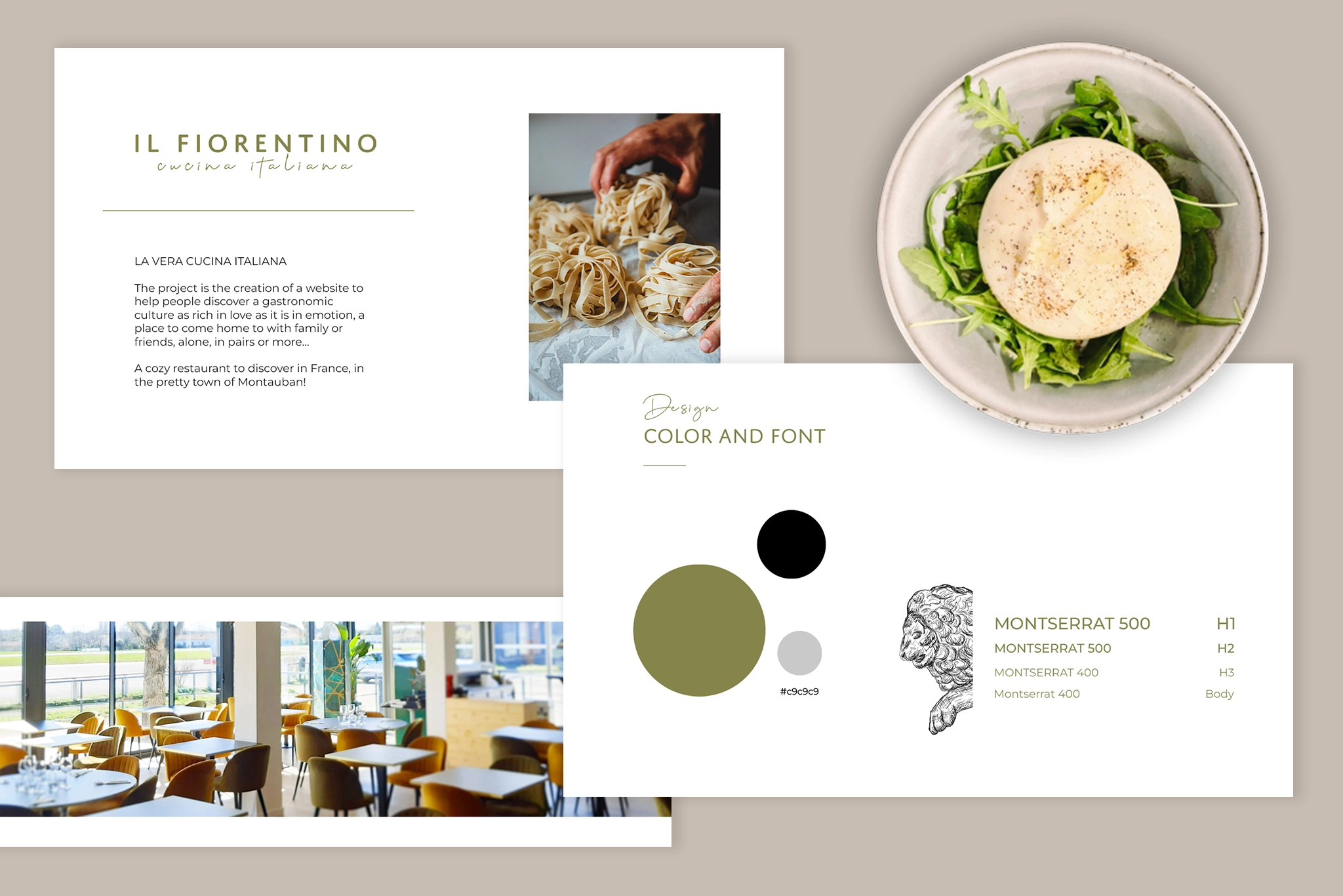 La demande du client était de créer une identité classe et chaleureuse de son lieu et qui reflète sa cuisine. Le logo a été imaginé en agence. Le vert olive, noir et blanc sont les couleurs dominantes qu’il fallait retrouver sur le site.