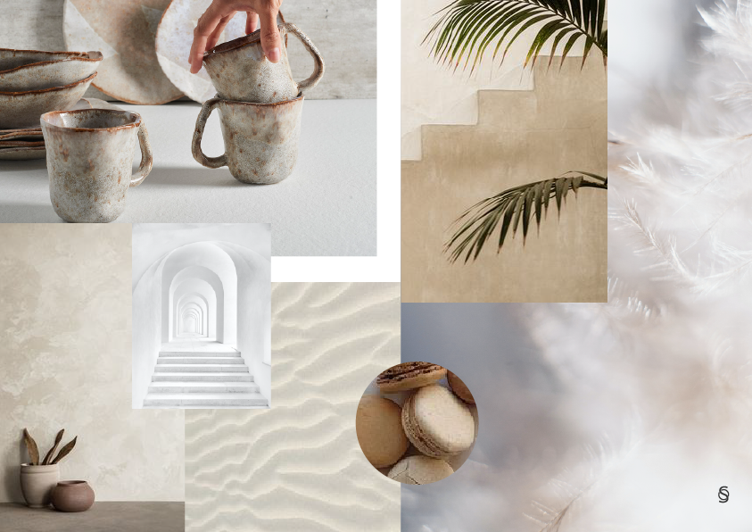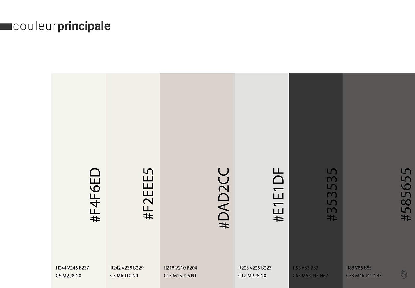 La palette de couleurs principale est un camaïeu de beige, symbolisant les multiples nuances de peaux, de la plus claire à la plus foncée. Cette harmonie visuelle subtile évoque l’inclusivité, mais aussi la douceur et la pureté des produits naturels proposés par la marque. Pour rehausser cette sobriété, des touches de mauve et de jaune doux ont été ajoutées. Le mauve, délicat et apaisant, apporte une dimension sophistiquée et spirituelle, tandis que le jaune doux introduit une note chaleureuse et positive, symbolisant la lumière et le bien-être.